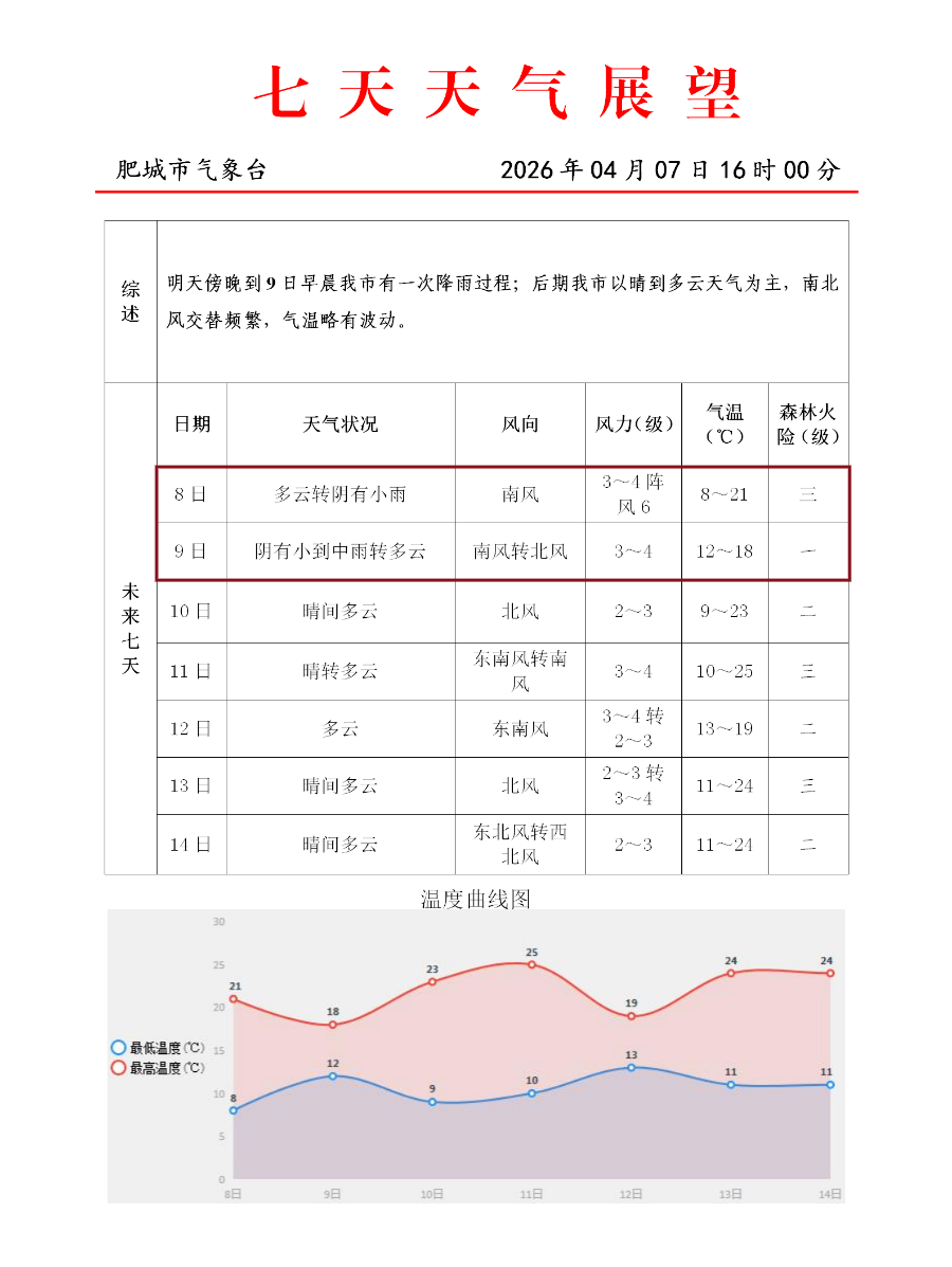 今天夜间到明天,多云转阴有小雨,南风3到4级阵风6级,最低气温8°C左右,最高气温21°C左右。