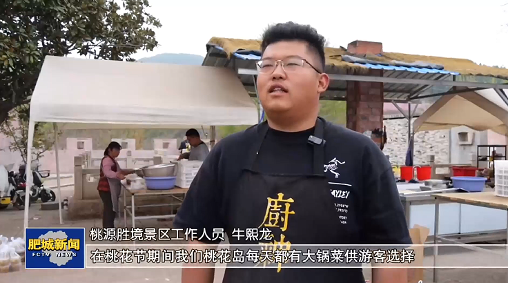 桃源胜境景区工作人员 牛熙龙在桃花节期间桃花岛每天都有大锅菜供游客选择,还有更多套餐,有两人餐、三人餐,有十人餐、八人餐。大锅菜的特点就是大锅炒的,肯定比较香。都用的柴火,不是用的天然气,炒出来比较具有乡土气息,游客量最多的时候,一天能接待五六百人。