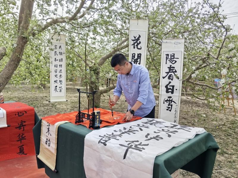 书法爱好者在苹果花海中挥毫泼墨。