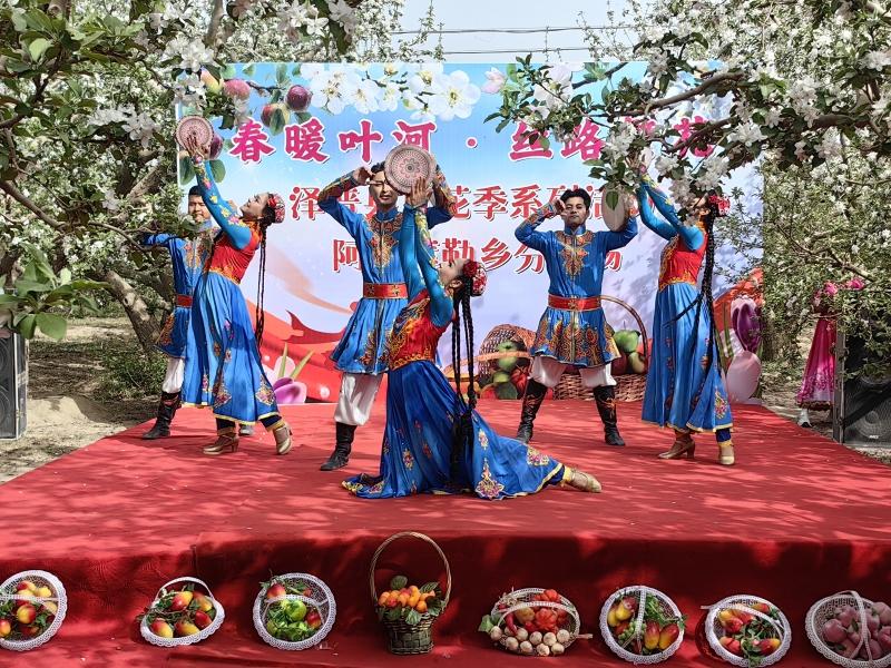 在阿依库勒乡苹果驿站,一场融赏花、游园、民俗展示于一体的特色文旅活动精彩启幕。伴随着欢快的文艺演出,活动现场秩序井然、氛围热烈。当地红枣、苹果、核桃等特色优质农产品集中展示,手工刺绣等非遗作品精巧细腻,尽显乡土文化与民间匠心。温馨舒适的亲子阅读区吸引不少家庭驻足体验,书香与花香相映成趣。乡村文艺队伍轮番登台,歌舞、弹唱等节目朴实生动、贴近生活,展现出新时代乡村的幸福气象。
