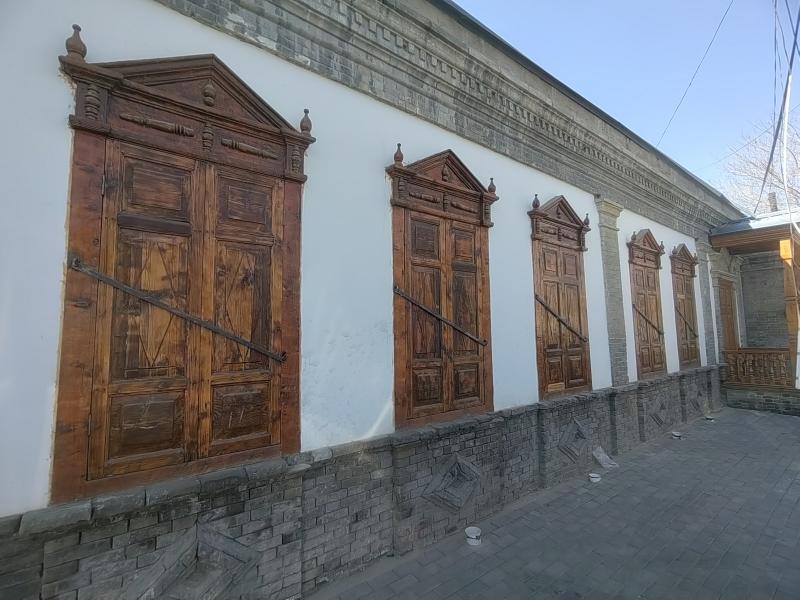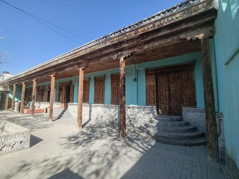走到道路尽头,有一条通往南边的小巷,就是阿依墩街四巷,进入小巷大约20米的地方,右手边有一扇原木色大门,看上去古朴光洁,门墩是用砖砌起来的,年代感十足。伊宁市住房和城乡建设局相关负责人介绍,这是阿依墩街四巷7号,建于1942年,院落占地面积623.6㎡,院落内历史建筑面积163.9㎡,是夯土结构建筑。