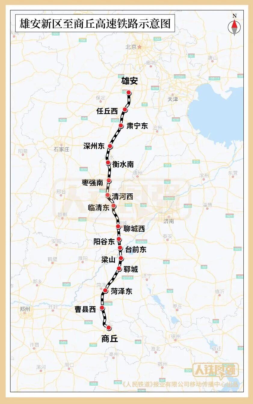 全线设雄安、任丘西、肃宁东、深州东、衡水南、枣强南、清河西、临清东、聊城西、阳谷东、台前东、梁山、郓城、菏泽东、曹县西、商丘16座车站。其中,雄安和菏泽东2座车站为既有车站,梁山、郓城、商丘3座车站为改扩建车站,衡水南等11座车站为新建车站。