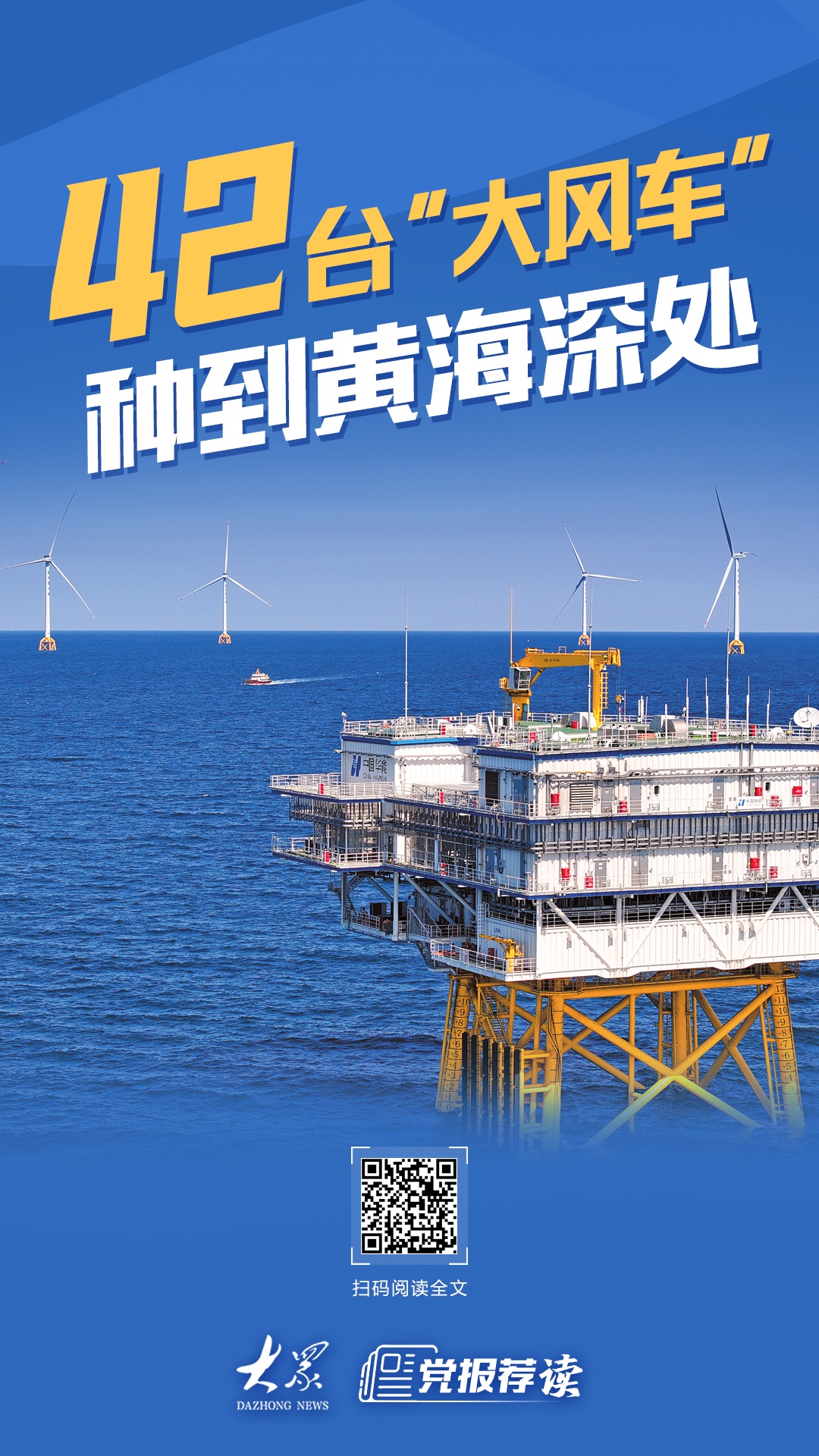 4月7日,“合闸”指令一出,距海岸约70公里处,42台“大风车”便于黄海北部广袤的深蓝海面上齐齐旋翼。