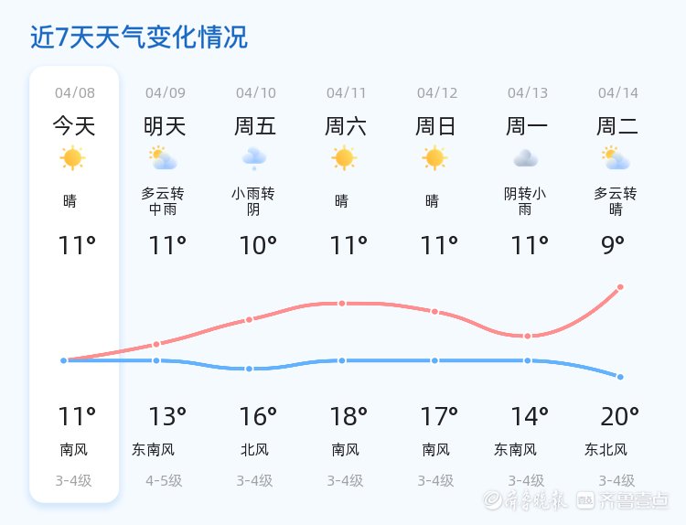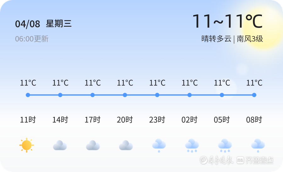 今天是4月8日,星期三,农历二月廿一。青岛市迎来了一天的晴转多云天气,气温适中,最高气温11℃,最低气温11℃,南风3级,空气湿度较高,为86%,PM2.5指数31,空气质量良好。各区天气情况基本一致,均为晴转多云,风力较小,适宜外出活动。