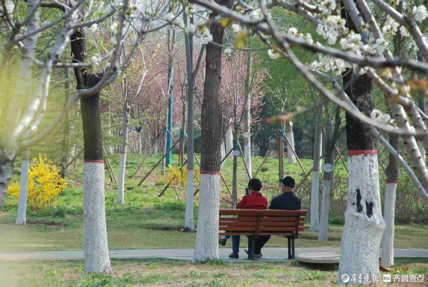 春日里,一对老夫妻远离花圃前拥挤的人群,在公园的一隅静静地享受着这美丽的风景。