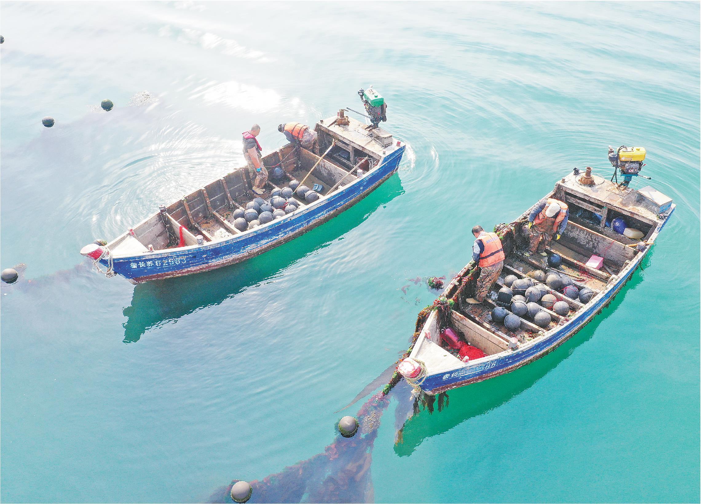 图为大钦岛渔民正在海上管护海带,为丰收作准备
