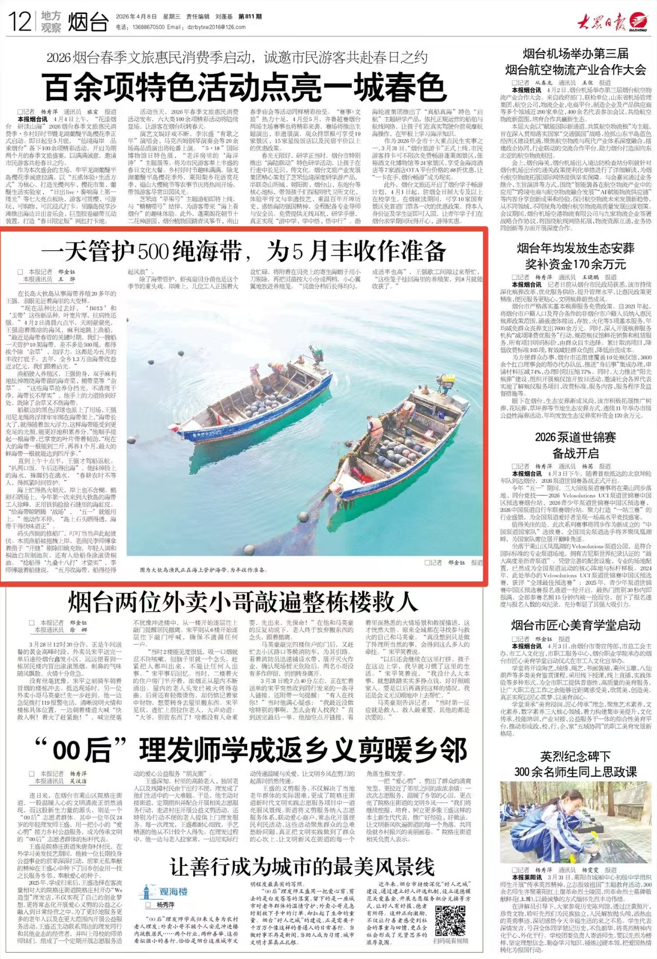 “现在品种比过去好,‘B013’和‘玉带’这些新品种,叶宽片厚,抗病性还强。”4月2日清晨六点半,天刚蒙蒙亮,王强迎着微凉的海风,麻利地跳上渔船,“最近是海带春管的关键时期,我们一艘船一天管护10架海带,差不多是500绳,都得挨个除‘杂草’、加浮力。这都是为五月的丰收打底子。去年,全乡1.3万亩海带收益近2亿元,我们跟着沾光。”