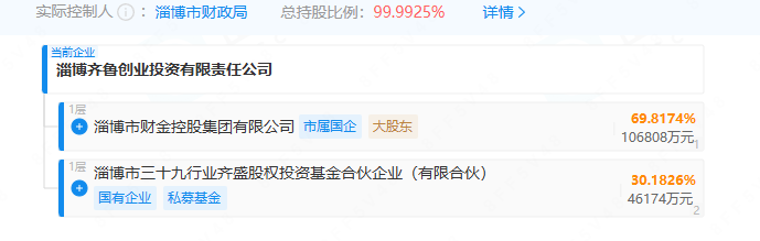 股权穿透显示,淄博市财金控股集团有限公司、淄博市三十九行业齐盛股权投资基金合伙企业(有限合伙)分别对其持股69.82%、30.18%,公司实际控制人是淄博市财政局。
