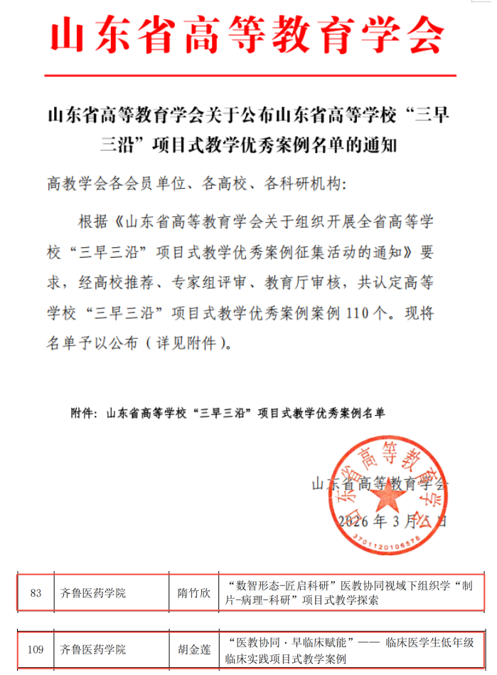 据山东省高等教育学会《关于公布山东省高等学校“三早三沿”项目式教学优秀案例名单的通知》,齐鲁医药学院申报的《“数智形态—匠启科研”医教协同视域下组织学“制片—病理—科研”项目式教学探索》和《“医教协同・早临床赋能”——临床医学生低年级临床实践项目式教学案例》,近日获批项目式教学优秀案例。