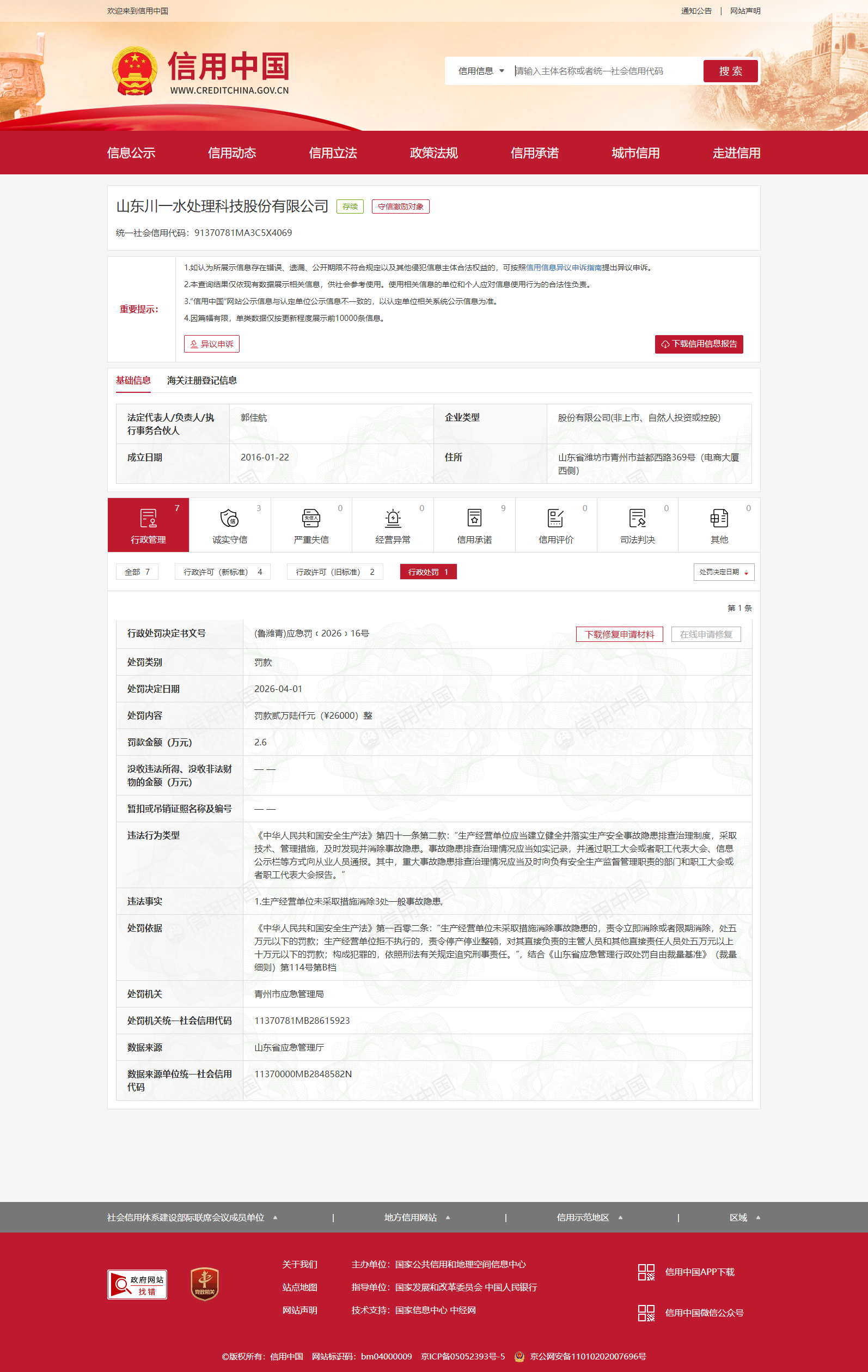 近日,青州市应急管理局发布行政处罚决定书(文号:(鲁潍青)应急罚﹝2026﹞16号),山东川一水处理科技股份有限公司因未采取措施消除3处一般事故隐患,被处以罚款人民币2.6万元。