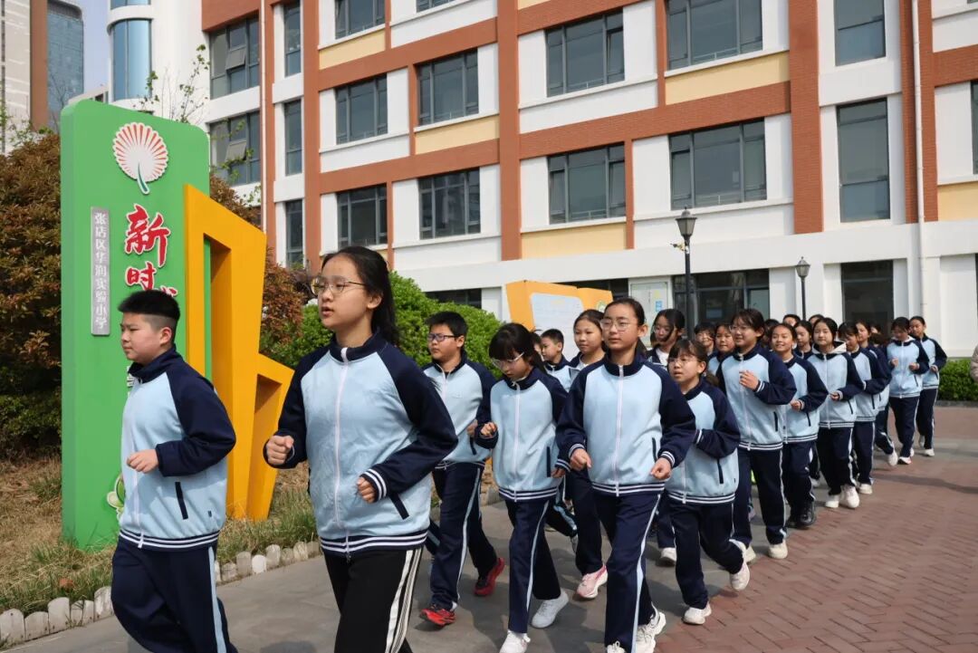 清脆的哨声响彻校园,各班迅速集结成整齐的方阵。孩子们身着统一的校服,昂首挺胸、眼神明亮坚定,校服上的校徽在春日阳光下熠熠生辉。队伍纵横对齐、步调一致,以规范有序的行进姿态展现着华润学子的良好素养。