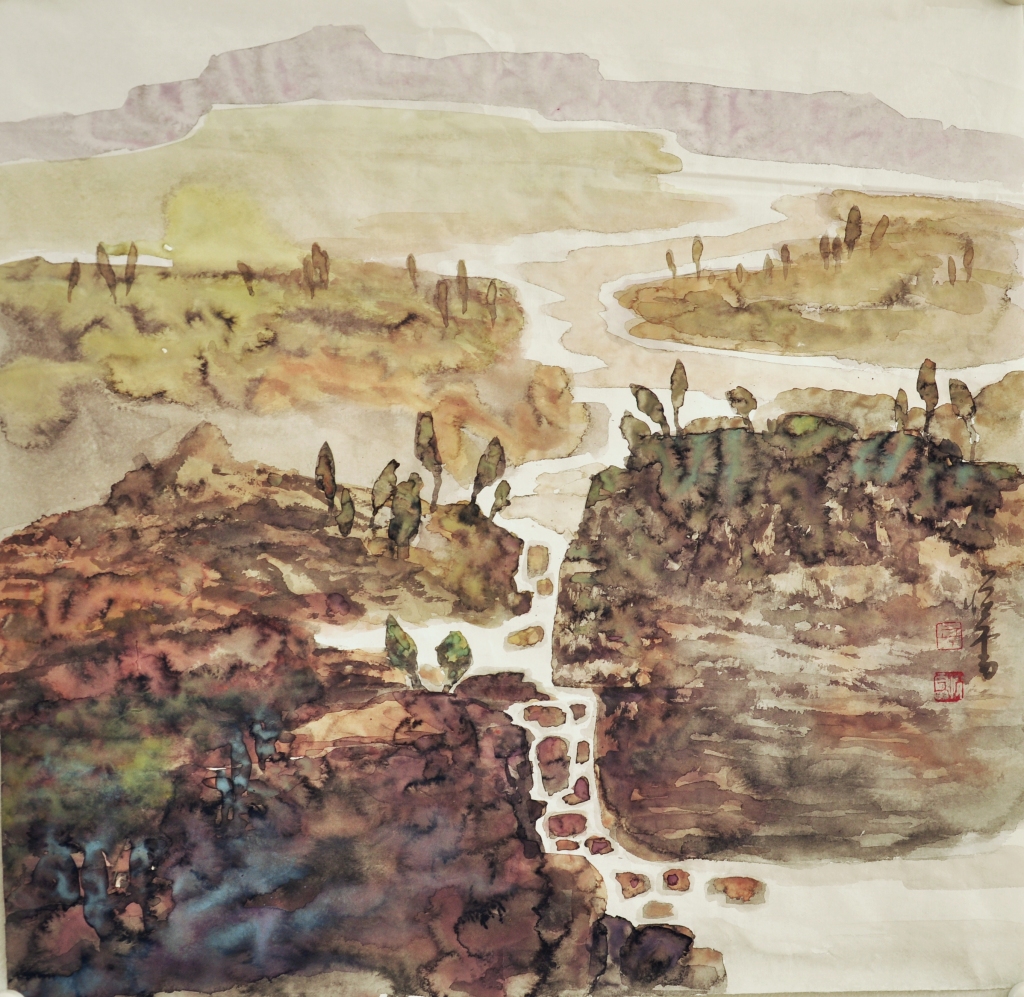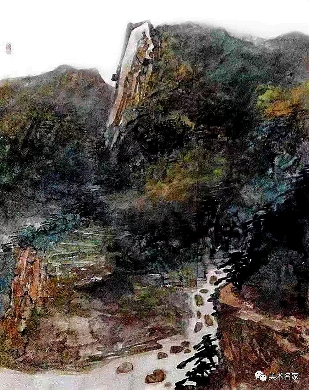 转眼到了2008年,他进入青岛名家书画创作院,与青岛的名家一起研究创作,但是他总感觉自己的山水作品没有形成鲜明独特的语言和艺术个性,创作似乎进入一个瓶颈期。他再次想到去北京,说走就走,坐上火车去了北京。时年2012年,他50多岁,已是知天命的年龄。在此期间,他每周都要去中国国家画院和北大听专家讲座,再一次让他脑洞大开,取众家之长开始探索创作,将自己创作了20多年的水彩、油画技法、原理与中国传统画结合,他找到了一个突破点:用没骨法画山水画。