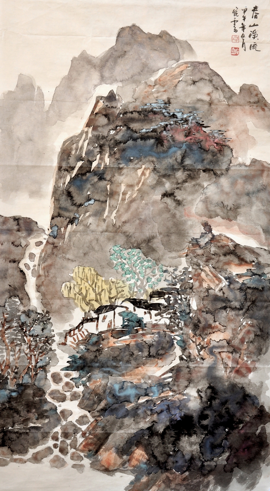他的一幅没骨法山水作品《浮山春浓》,让我对没骨法山水画的魅力深深折服。这是一幅写生创作山水画,以浮山一侧为原型构图的山水画。尽管一眼便可看出这是浮山的一角,但是它已不是十分具象的浮山,是画家精心选取浮山一角进行艺术性构图的浮山。底部,一条潺潺流淌的小溪,青绿、灰黑色、浅赫色的树木岩石从此交集着向上延伸,峰顶大片的浅褐色夹白的山崖,岩顶是浓郁的墨绿、浅蓝混杂的树木。整幅作品以墨为骨,以色为肉,没骨法撞色撞水的技法与西画的色彩关系、光影感受、肌理效果等巧妙融合,传统水墨的氤氲与现代绘画的肌理厚度光影对比兼具,在色彩的浓淡间表现出一种抑扬顿挫的节律感。
