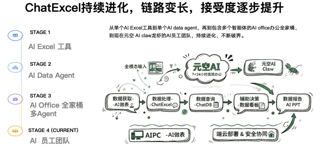 我们定位“AI for data”,从单场景单任务,逐步拓展到全模态数据处理,推出ChatDB、数据看板、AI PPT、AI文档报告等产品, 从单点Agent延伸到全产业链服务 ,这个过程既依托模型成熟,也顺应了用户需求的变化。