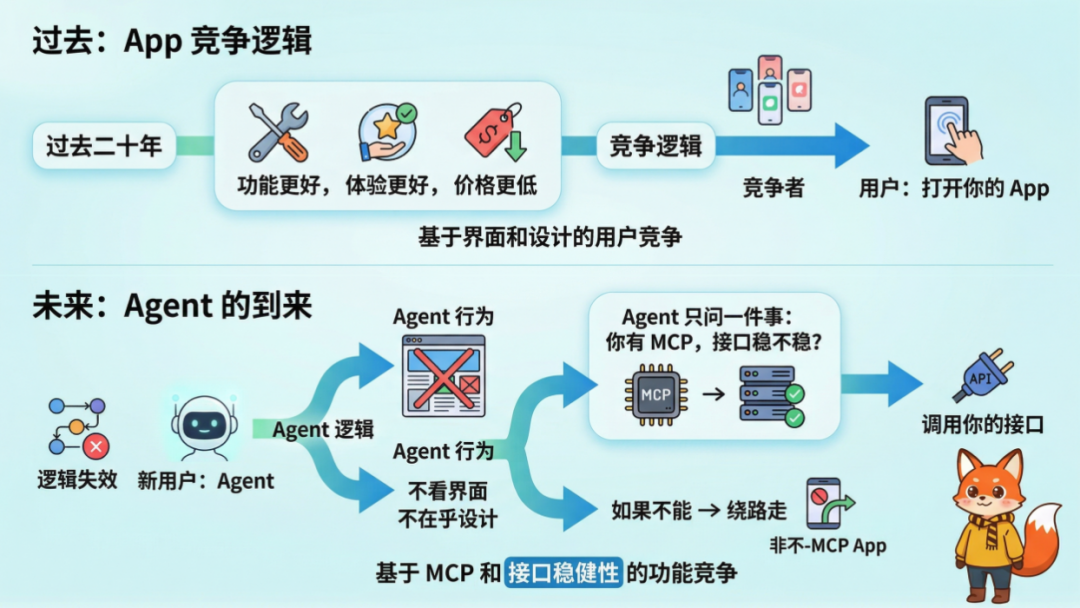 而AI Agent到来后,竞争彻底改写:新用户不再是人,而是Agent。Agent不看界面、不在乎设计,唯一决策标准是 你有没有MCP(模型上下文协议)?接口稳不稳?