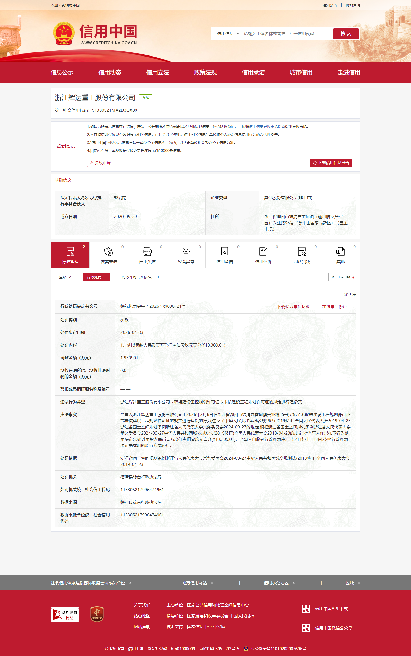 浙江辉达重工股份有限公司因违规建设被罚1.93万元