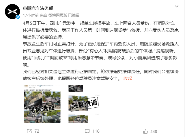 4月7日下午,小鹏汽车法务部发布公告,回应近日发生的四川广元单车碰撞事故。