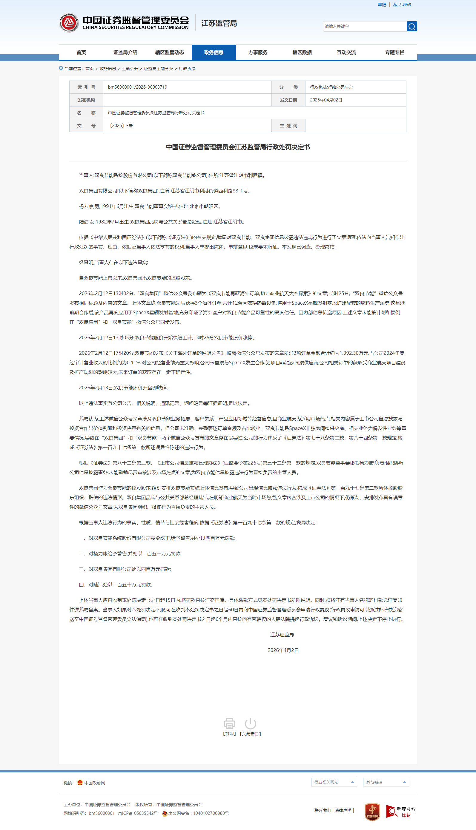 根据《中华人民共和国证券法》第一百九十七条第二款,江苏证监局作出如下决定:对双良节能系统股份有限公司责令改正,给予警告,并处以400万元罚款;对双良节能董事会秘书杨力康(负责组织协调信息披露事务)给予警告,并处以250万元罚款;对控股股东双良集团有限公司处以400万元罚款;对双良集团品牌与公共关系部总经理陆洁(策划、安排发布误导性文章)给予警告,并处以250万元罚款。上述罚款合计1300万元。处罚决定日期为2026年4月2日。