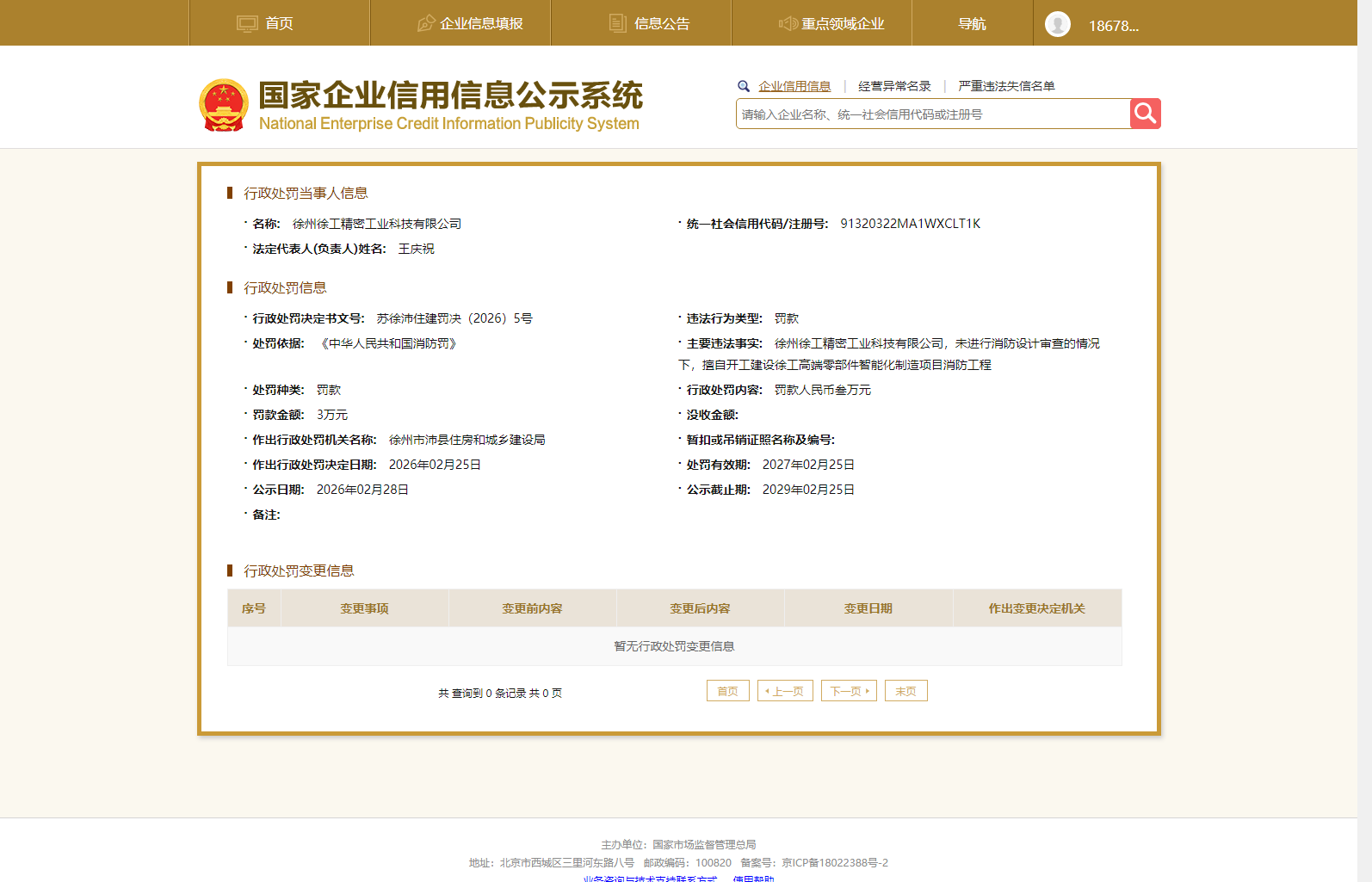 近日,徐州市沛县住房和城乡建设局发布行政处罚决定书(文号:苏徐沛住建罚决(2026)5号),徐州徐工精密工业科技有限公司因在未进行消防设计审查的情况下擅自开工建设消防工程,被处以罚款人民币叁万元整(¥30,000)。