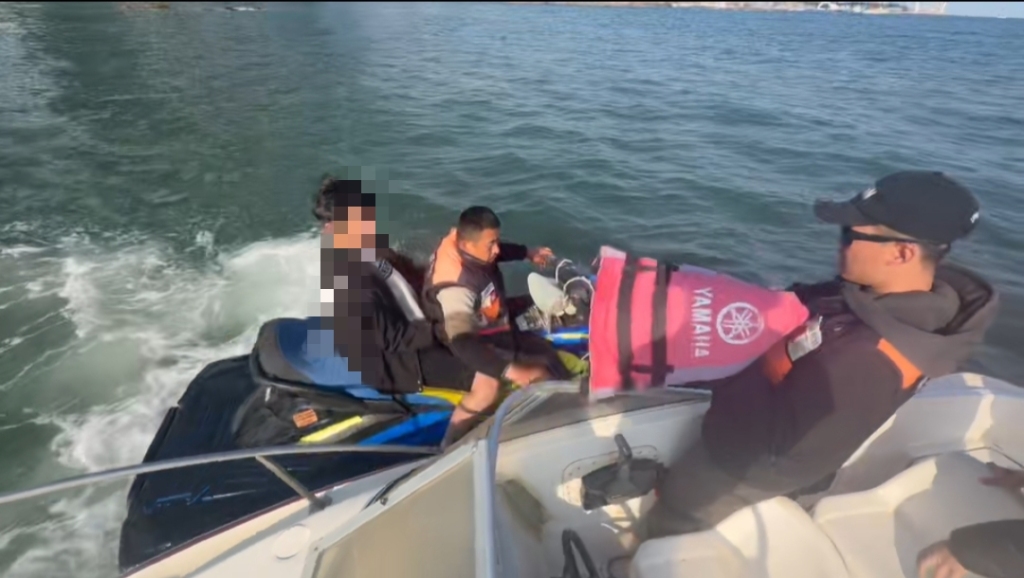 由队长田堂山带队,队员张志斌驾驶摩托艇,王丕龙、薛钰烨、焦昌琨驾驶救援艇协同救援。救援人员抵达现场时,两名游客被困礁石区,海水已漫过礁石,随时有被卷入大海的危险。现场周边礁石密布,救援难度较大。田堂山队长果断指挥张志斌驾驶摩托艇,与到场消防队员密切配合,迅速靠近被困游客。从抵达现场到成功将两名游客救上艇,全程仅用时3分钟。
