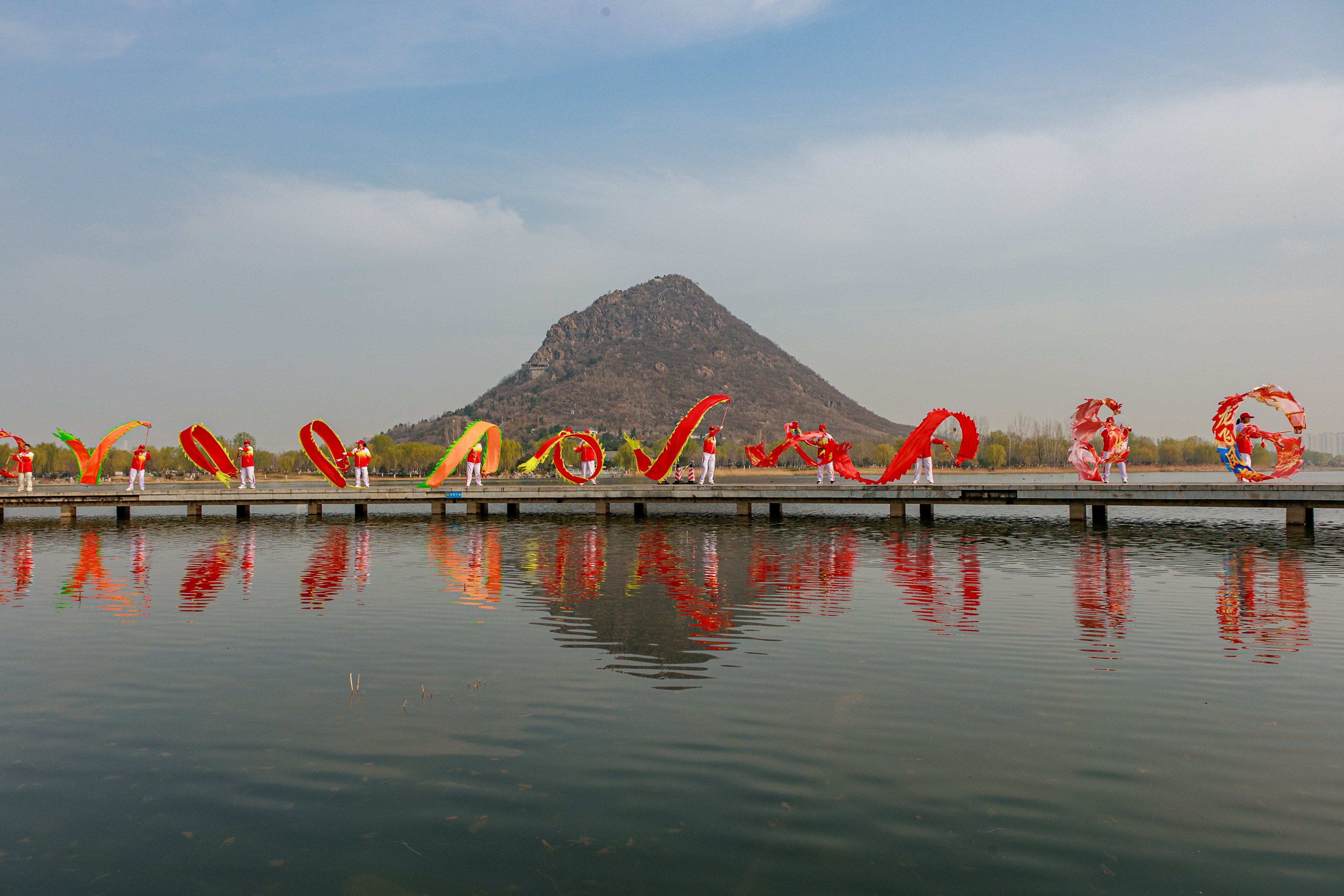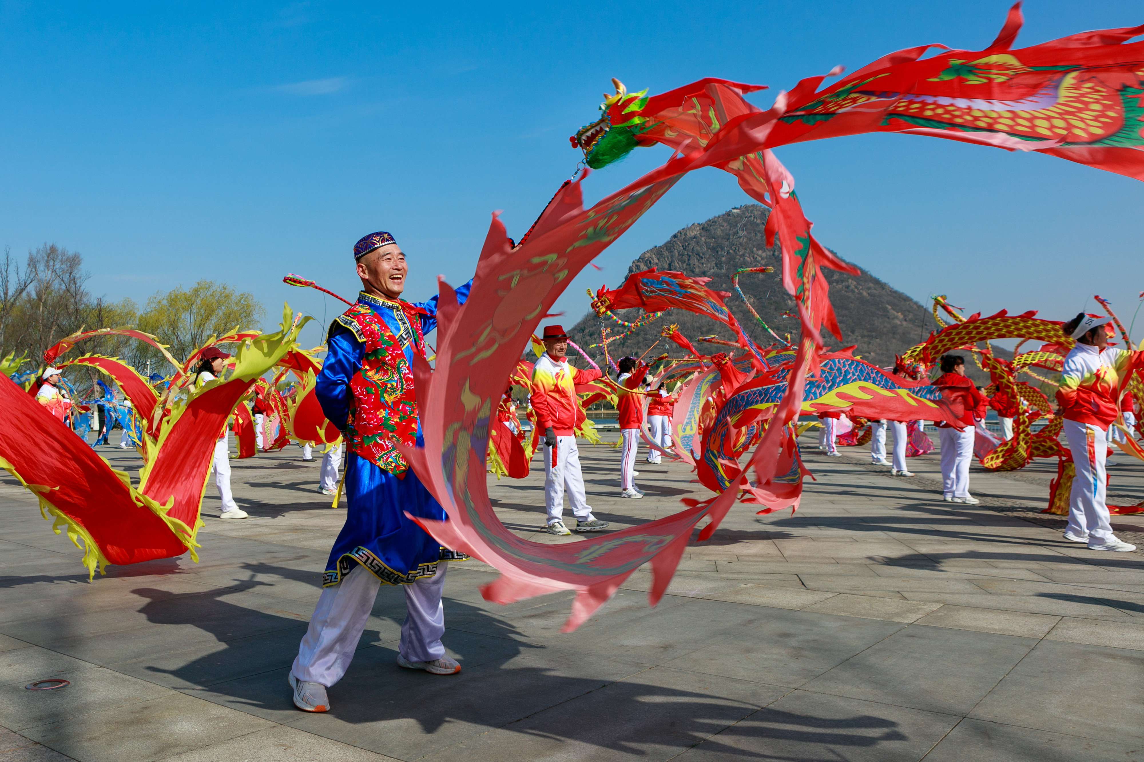 作品介绍:本组作品拍摄于2026年3月19日,彩龙爱好者在山东省济南市历城区华山湿地公园映华广场舞彩带龙。