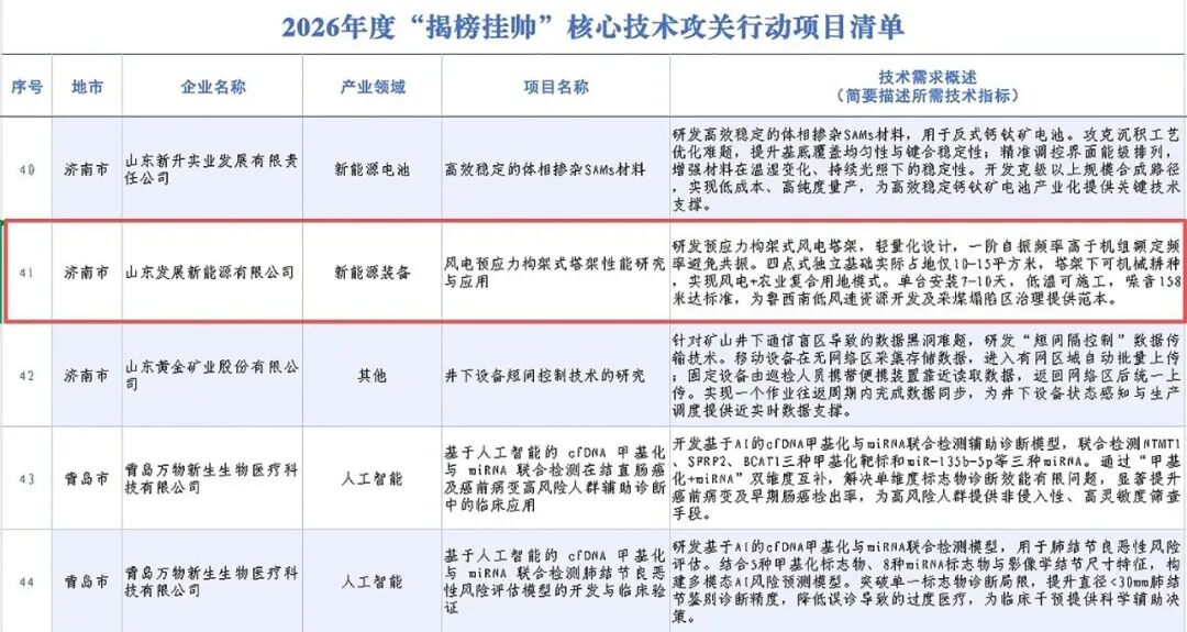 近日,山东省2026年“揭榜挂帅”核心技术攻关专项行动首批征集榜单发布,山东发展集团直属企业发展新能申报的《风电预应力构架式塔架性能研究与应用》项目成功入选,标志着发展新能在新能源装备领域迈出重要一步。