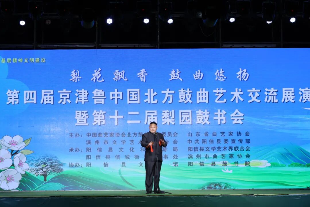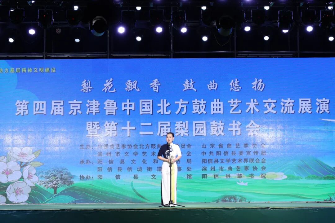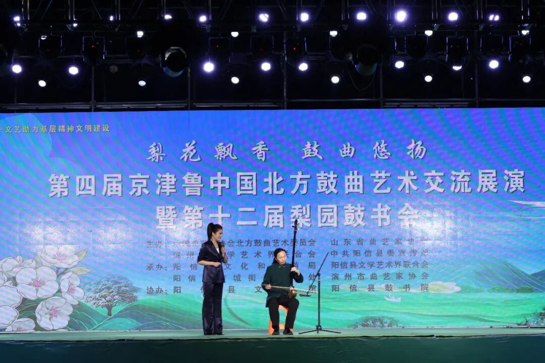 4月4日,“梨花飘香 鼓曲悠扬”——第四届京津鲁中国北方鼓曲艺术交流展演暨阳信县第十二届“梨园鼓书会 ”在滨州市阳信县举办。中国曲协副主席冯欣蕊,中国曲协北方鼓曲艺委会秘书长杨菲,山东省曲协主席慈建国,山东省曲协副主席芝麻、闫磊、罗晓静,滨州市文联党组成员、副主席王其槐,阳信县委书记蒋海华等出席活动。