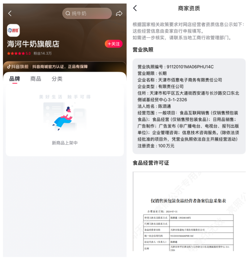 截图信息显示,涉事直播账号为“海河牛奶旗舰店”,该旗舰店账号认证主体为天津市佰意电子商务有限责任公司。