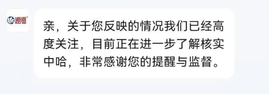 另据媒体报道,4月7日,海河牛奶旗舰店客服表示:“关于您反映的情况我们已经高度关注,目前正在进一步了解核实中。”