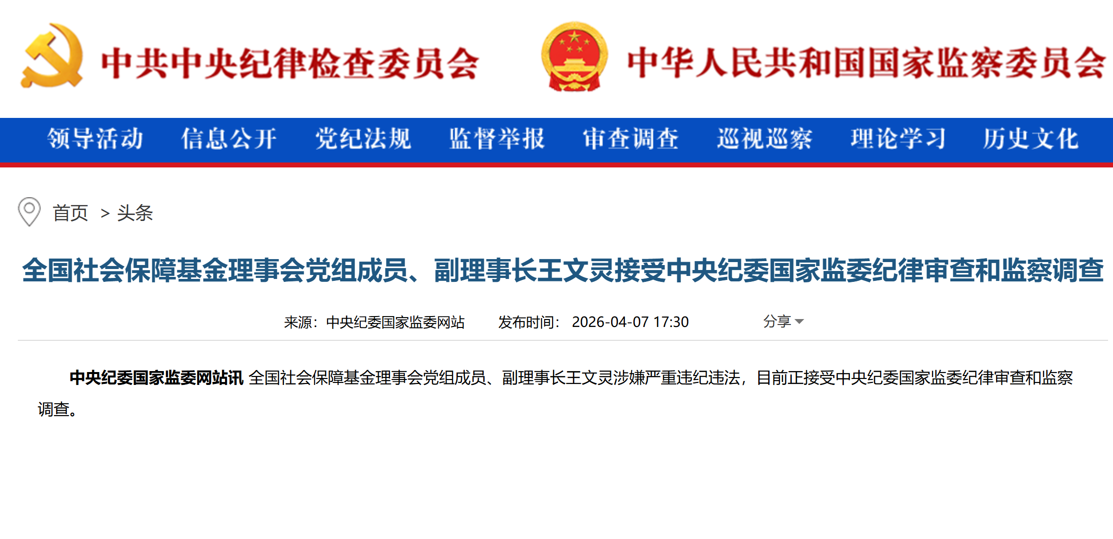 中央纪委国家监委网站4月7日消息,全国社会保障基金理事会党组成员、副理事长王文灵接受中央纪委国家监委纪律审查和监察调查。