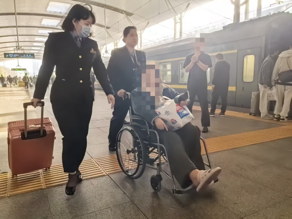 次日早晨列车抵达武昌站后,车站工作人员早已推着轮椅在站台等候,列车长刘鹏、列车员刘怡与车站人员默契配合,小心搀扶陈女士下车、换乘轮椅,一路护送她安全出站。连续两次乘车遇困,都遇上同一组贴心工作人员,陈女士连连道谢,直言铁路服务让她倍感安心。