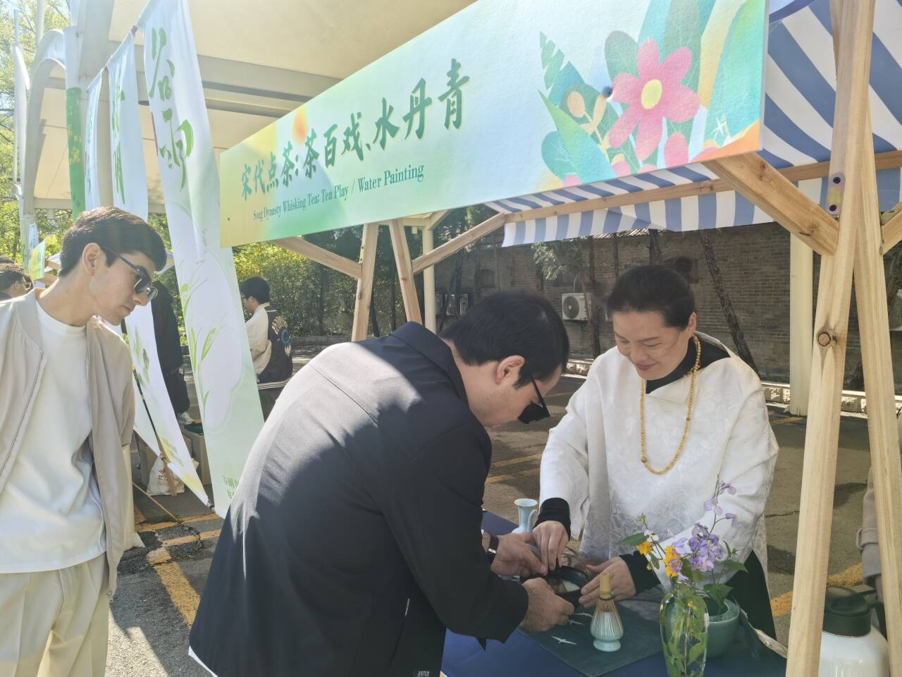 随后在国际和平主题公园里,中外学生们踏春寄情,在自然与人文交融中体悟和平之美。在促消费区域,场馆联动本地商户,向中外青年展示清明民俗与非遗,潍坊朝天锅非遗代表性传承人丁俊方现场教学饼卷鸡蛋制作,青团、麦仁粥等传统寒食免费品尝,宋代点茶、绘彩蛋、碰彩蛋等民俗体验轮番登场。外国青年不仅在沉浸式体验中读懂中国节气文化,还深刻感受到了潍坊的民俗传统与人文精神,并且与中方青年学生一起,在交流对话中凝聚起跨越国界的和平共识。