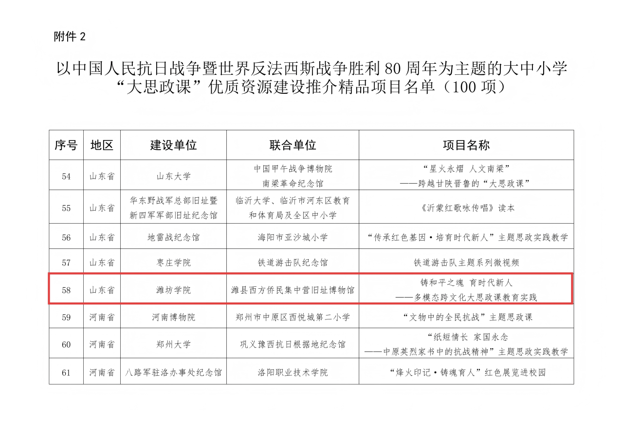 近日,教育部、国家文物局联合公布中国人民抗日战争暨世界反法西斯战争胜利80周年主题大中小学“大思政课”优质资源建设推广项目评选结果,潍坊学院与潍县西方侨民集中营旧址博物馆联合申报的《铸和平之魂,育时代新人:基于潍县西方侨民集中营旧址博物馆的多模态跨文化“大思政课”教育体系建构与实践》成功入选全国精品项目,成为山东省5个入选项目之一。