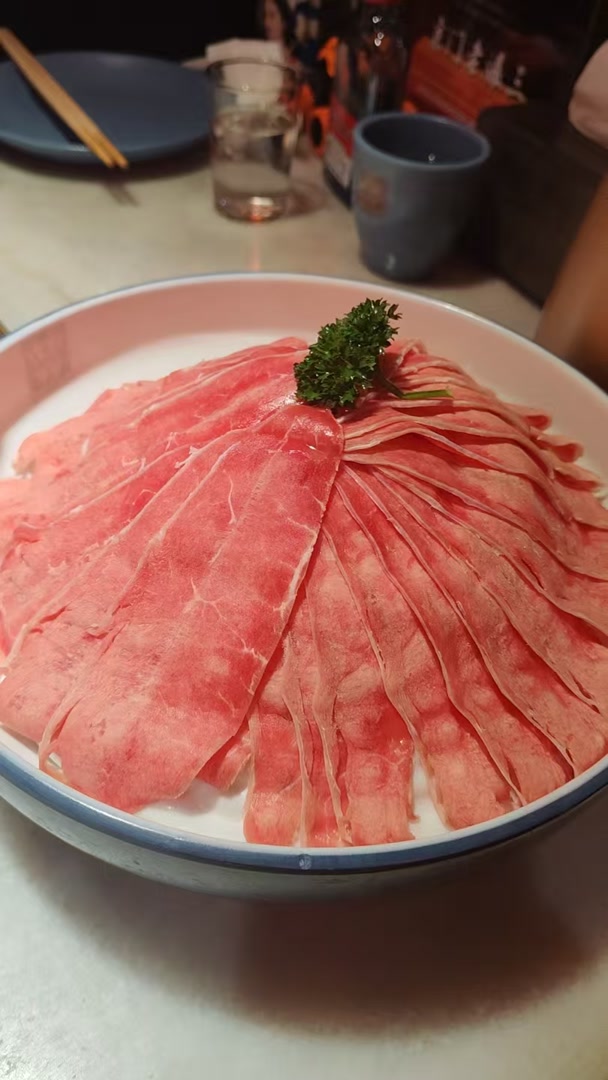 服务员介绍,店里每份肉的重量大约都在“三两半(0.175千克)”左右,只有个别大拼盘在“六两(0.3千克)”左右。精品雪花牛板腱就属于每份0.175千克的出餐标准。