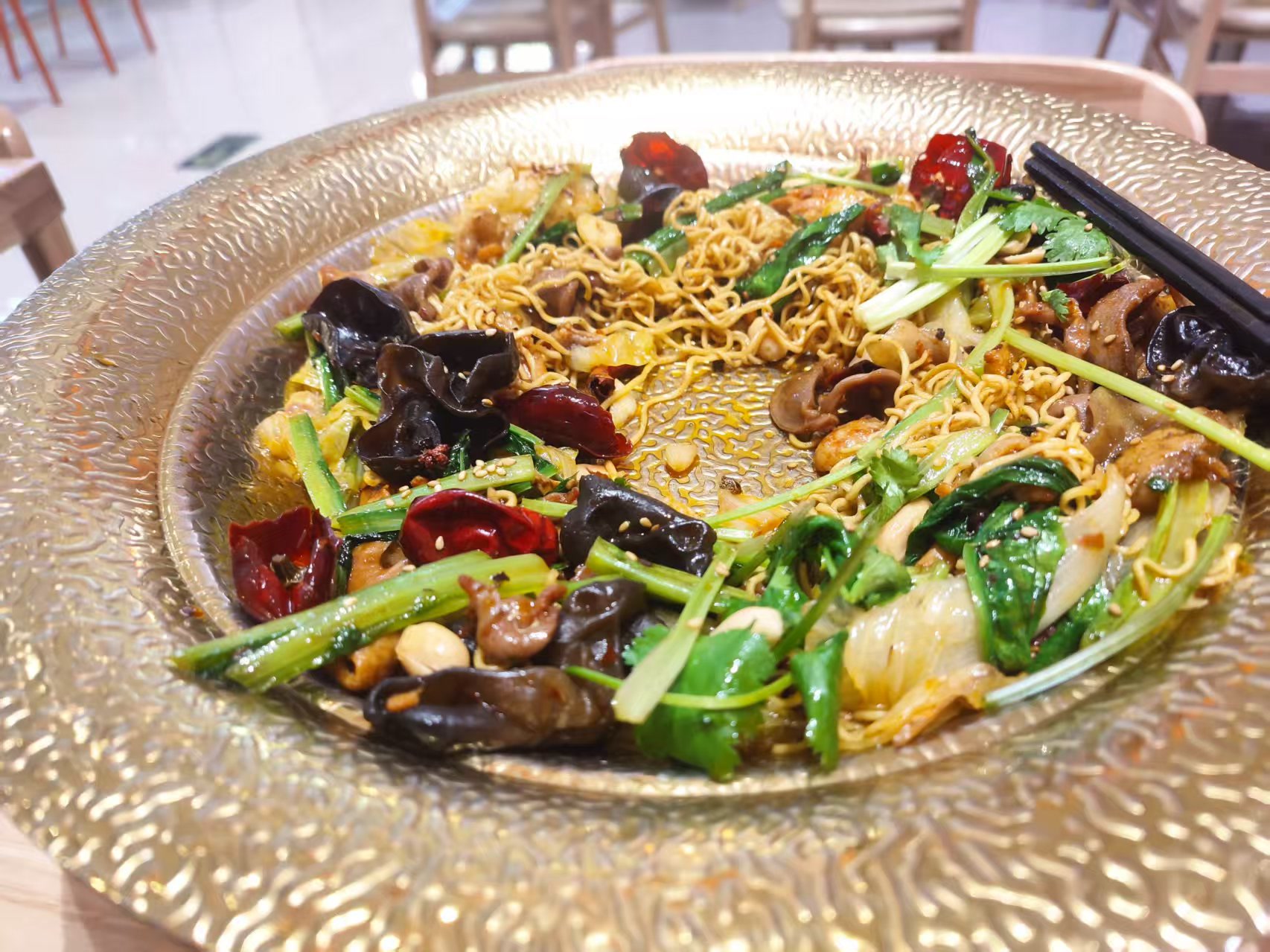 这家麻辣香锅(银泰店)端上来的餐盘又大又圆,实际餐盘深度很有限