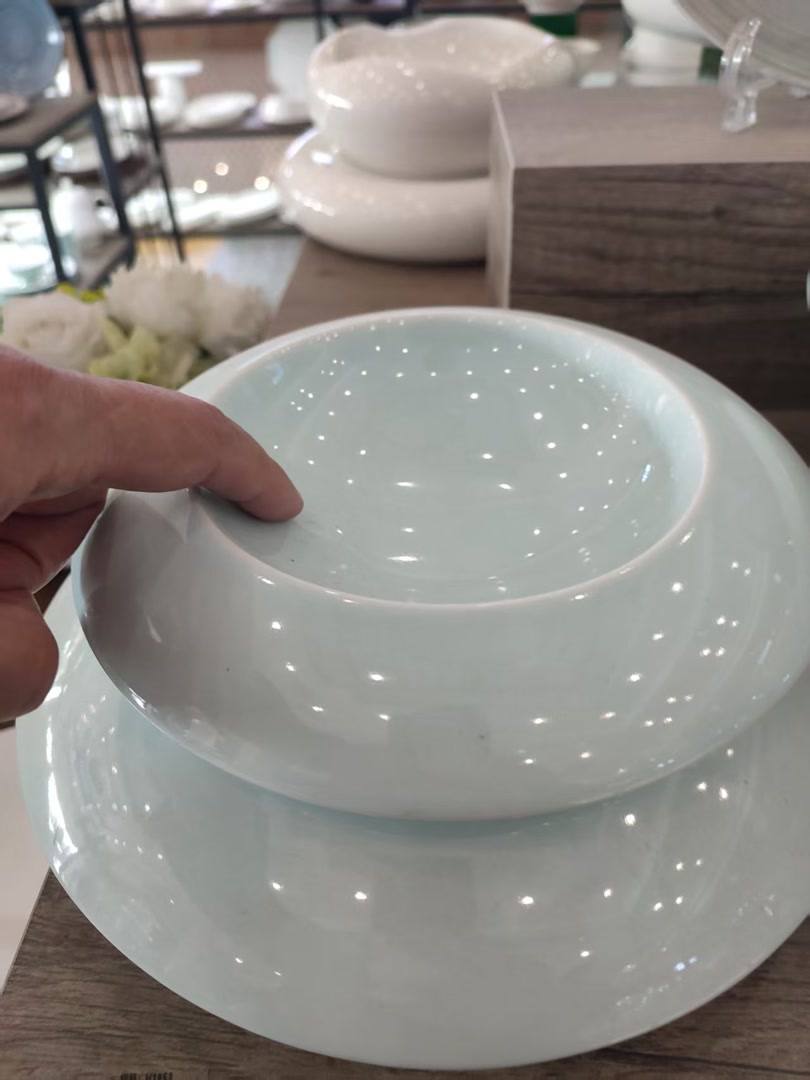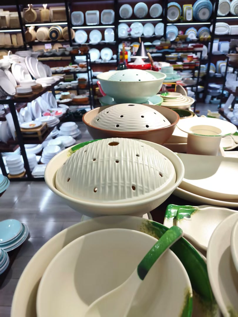 大厅有不锈钢、陶瓷、密胺等多种材质的餐具供应。一家店铺里有各式各样的大碗。“吃面用的。”老板介绍,一整个货架的大碗都专供面馆。有造型浑圆的传统青花大碗,有上宽下窄的新式面碗。从视觉上看,两种碗的碗口都属于宽口,但前者碗身饱满,从宽到窄过渡缓慢,后者碗身凌厉,从宽到窄过渡迅速。