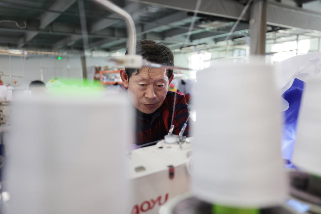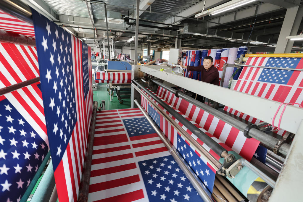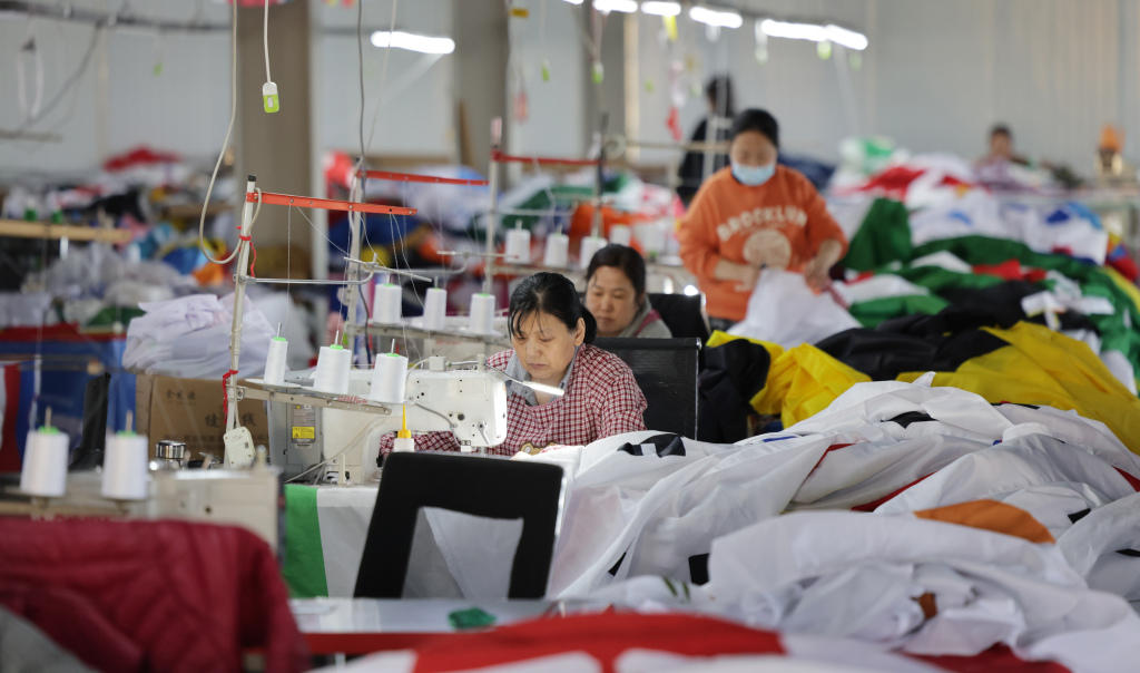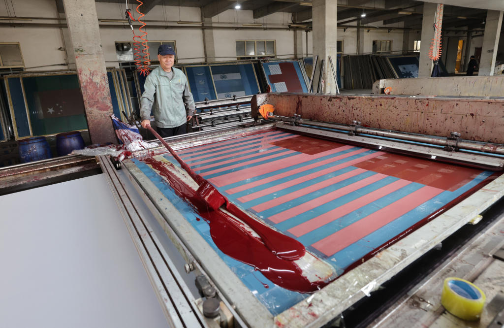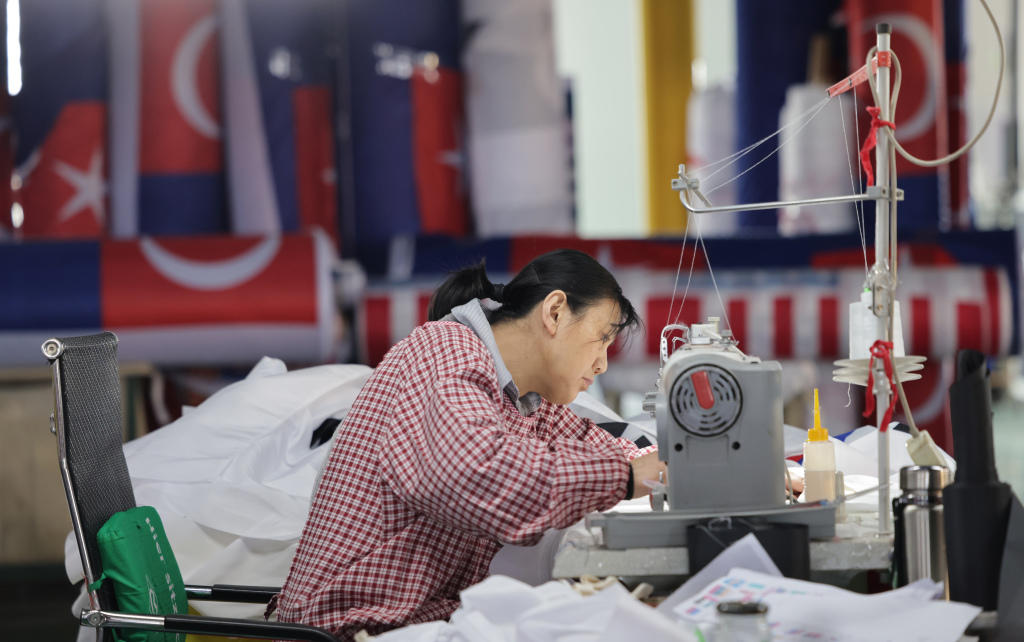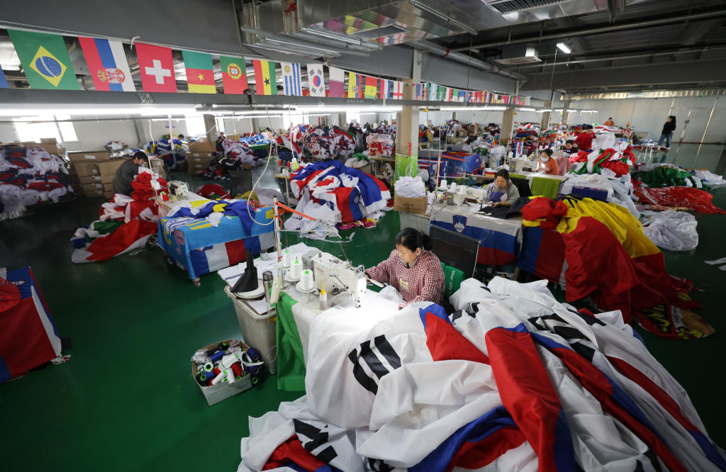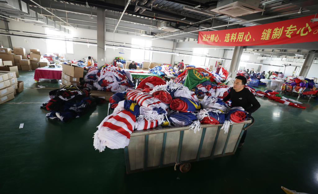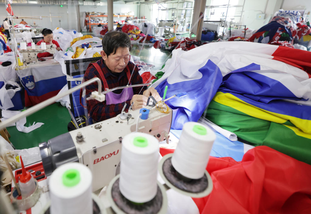 忙碌的缝纫车间,随处可见制作好的旗帜