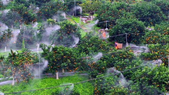 在重庆江津区夏坝镇太阳橙基地,管护人员利用微弥雾系统浇灌橙园。新华社发