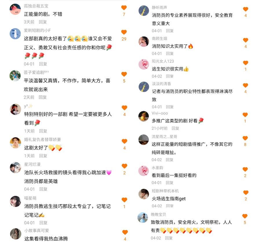 该剧的热播也引发微短剧行业与观众的双重热议,成为清明档兼具“流量热度”与“口碑质感”的微短剧代表作。观众在评论区纷纷表示,“这部消防微短剧把专业度和甜宠感平衡得太好了,追剧的同时还能学逃生知识”“火场救援的镜头太真实了,为森林消防员点赞”“微短剧就该这样,既有娱乐性又有社会意义”;行业内则认为,该剧为消防等垂直公益题材的微短剧创作提供了全新思路,实现了垂直题材与微短剧赛道的完美适配。
