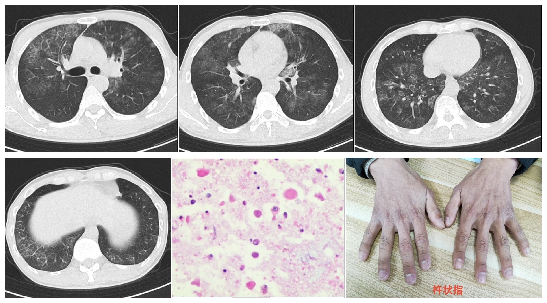 患者因“咳嗽、喘憋2月余”入院,进行性加重,查体发现杵状指,胸部CT显示双肺弥漫性“铺路石征”,犹如双肺被“磨玻璃”覆盖。经支气管镜灌洗及病理检查,确诊为“肺泡蛋白沉积症”。这是一种因肺泡内大量磷脂蛋白样物质异常沉积,导致肺无法有效进行气体交换的罕见病。若不及时干预,将引发严重呼吸衰竭。