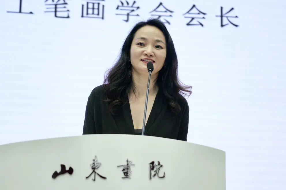 罗寒蕾介绍了广东省工笔画学会在三月份举办了“生而有灵”的第一次展览,计划每年推出十位不同艺术家,通过十年的累积持续延续艺术交流活力。此次,广东省工笔画学会怀着学习取经的热忱来到美术强省山东,在山东画院开展交流活动,走进画家画室深入交流,通过此次活动感受了到深厚的艺术文化底蕴,汲取了继续前进的深刻动力。她在发言中感谢了山东画院的支持、幕后人员的辛勤付出,以及每一位观众的关注。