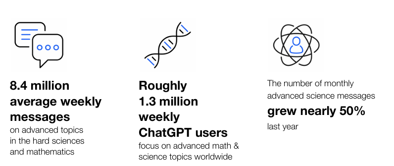每周,ChatGPT上产生840万条高级科学和数学话题的对话,这些对话来自全球130万活跃用户。2025年,与高级科学相关的消息数暴涨50%。