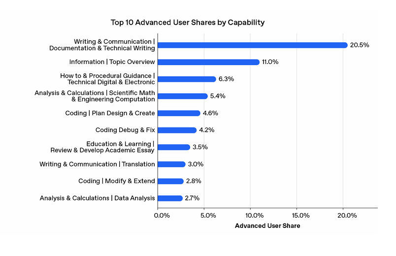 这些科学家使用AI的方式和普通人相比,更专注。更深入。消息量是普通用户的3.5倍,编程相关消息频率高出12倍。他们的工作流高度集中在代码生成与调试、数据分析、数学推导、文献综述。