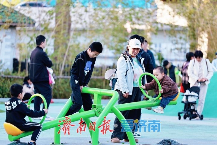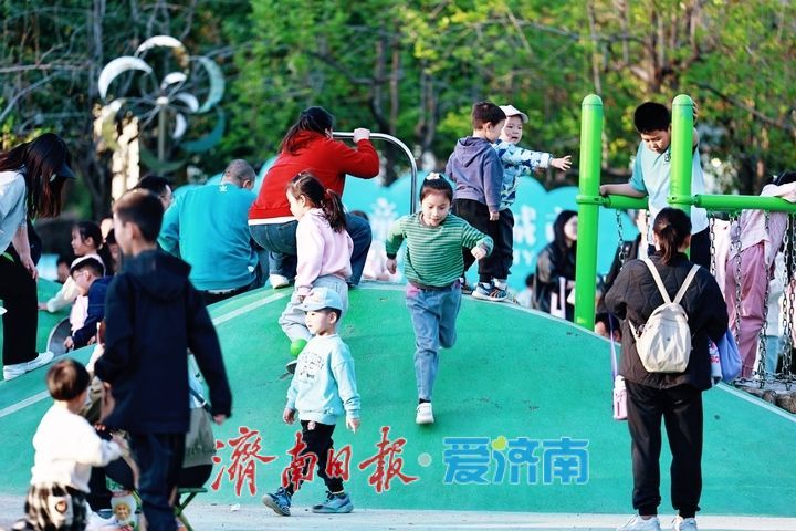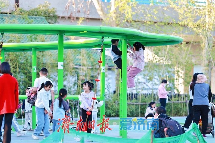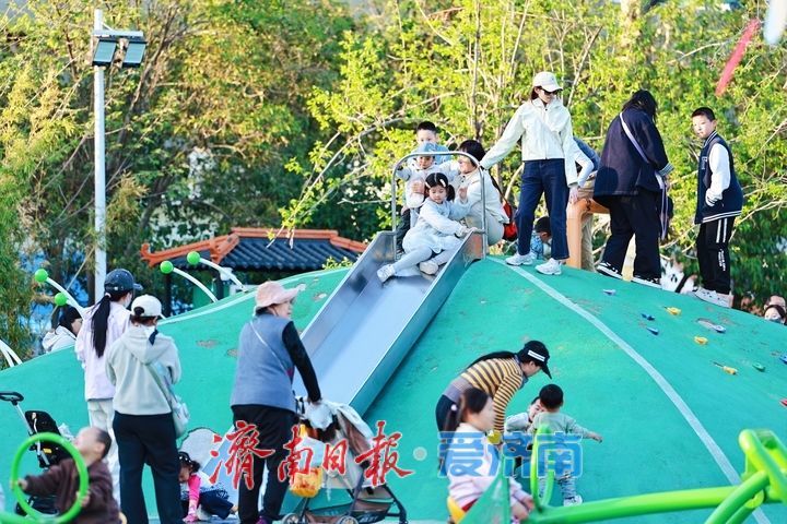 孩子们在滑梯上畅快滑行,在沙池里肆意玩耍,在攀爬区勇敢挑战,清脆的笑声与大明湖的潺潺湖水声相映成趣;家长们或陪伴孩子互动嬉戏,或在一旁休憩赏湖,尽享惬意的亲子休闲时光。不少市民表示,以往遛娃要么奔波远途,要么担心设施不安全,如今在家门口的大明湖就能找到这样一处环境好、设施全、还免费的乐园,既能让孩子释放天性、锻炼身体,又能欣赏湖光美景,实在是太方便了。