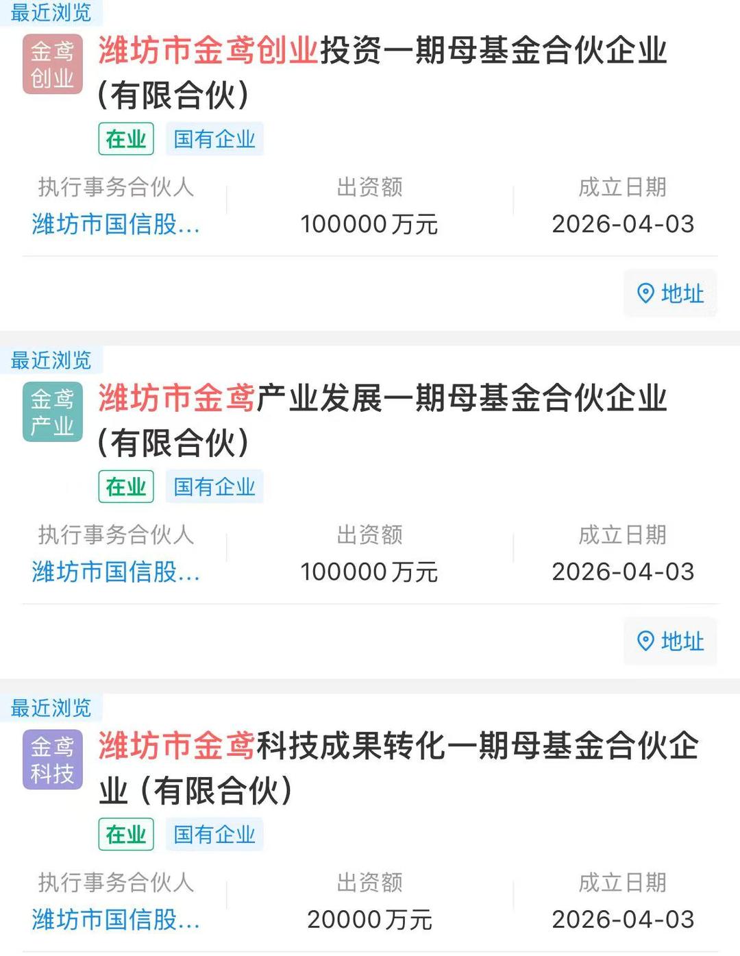 具体来看,潍坊市金鸢产业发展一期母基金合伙企业(有限合伙)出资额10亿元,注册于潍坊市奎文区,行业分类为投资与资产管理。潍坊市金鸢创业投资一期母基金合伙企业(有限合伙)出资额10亿元,注册于潍坊高新区,行业分类为创业投资。潍坊市金鸢科技成果转化一期母基金合伙企业(有限合伙)出资额2亿元,注册于潍坊市奎文区,行业分类同样为投资与资产管理。三家企业执行事务合伙人均为潍坊市国信股权投资管理有限公司。