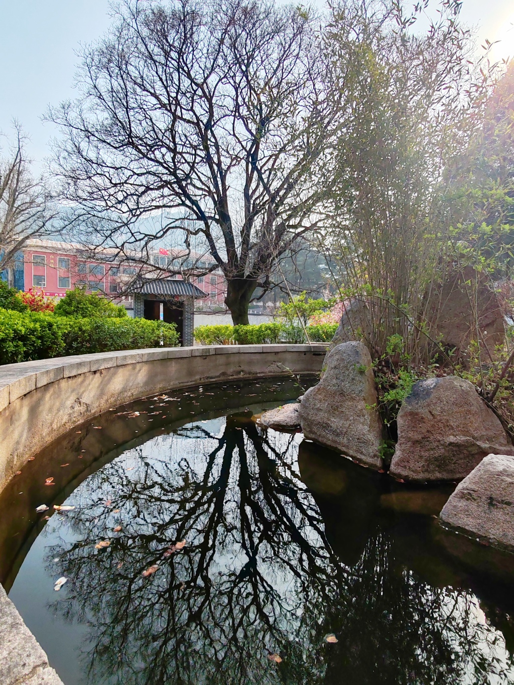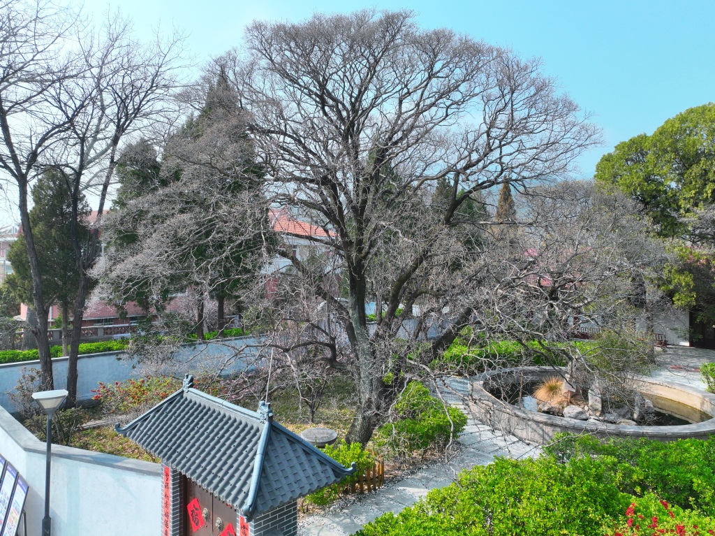 作为游客必去景点之一的崂山北九水风景区,不仅自然景观优美,生活在这里的古树名木更被称为活的文物,记载了崂山的历史和文化变迁。在景区内,启迪高级中学三面环山,校园中百年古树就有11株,据传为元代丘处机亲手所植800多岁树龄的古银杏树为一级古树。4月8日,记者来到这所古树葱郁的校园里,伴着不远处山林间传来的清脆鸟鸣声,见到了挺拔苍翠的银杏、黄杨、流苏、玉兰、贴梗海棠等共11棵古树,这些古树不仅是岁月的见证者,更是“十年树木,百年树人”的精神象征,蕴含深厚的文化和历史积淀。