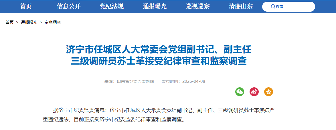 济宁市任城区人大常委会党组副书记、副主任、三级调研员苏士革被查打虎拍蝇猎狐 | 2026-04-08 18:44:50 微信扫码扫码下载客户端据济宁市纪委监委消息:济宁市任城区人大常委会党组副书记、副主任、三级调研员苏士革涉嫌严重违纪违法,目前正接受济宁市纪委监委纪律审查和监察调查。责任编辑:李思羽