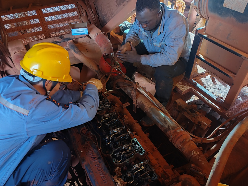 几内亚博法矿区的维修车间里,席超湖老师半蹲在车轮旁,一边拆卸柴油滤芯,一边向当地员工演示操作要领;主营区会议室中,刘佳睿和张铭鑫老师正带着学员们做“声调操”,大家跟着抬手比划,齐声念着“hǎo”。这两个画面,正是滨州职业学院“职教出海”的生动剪影。