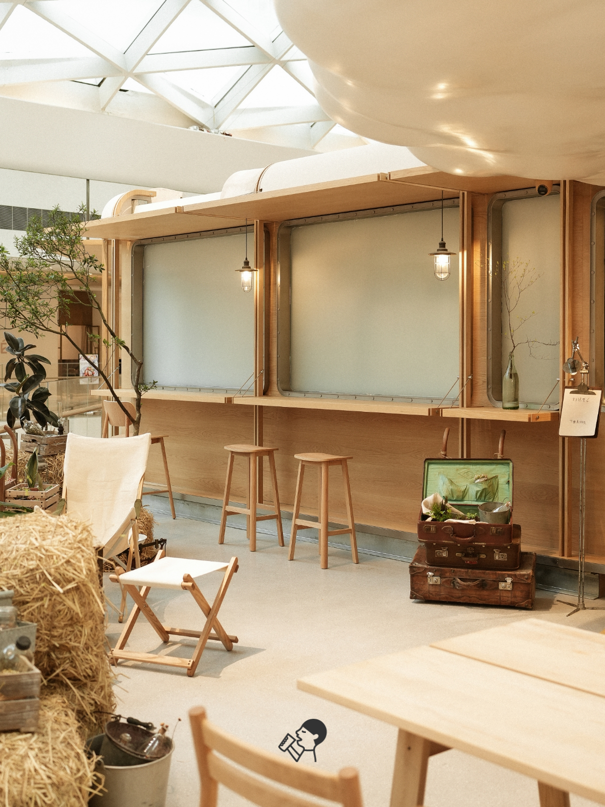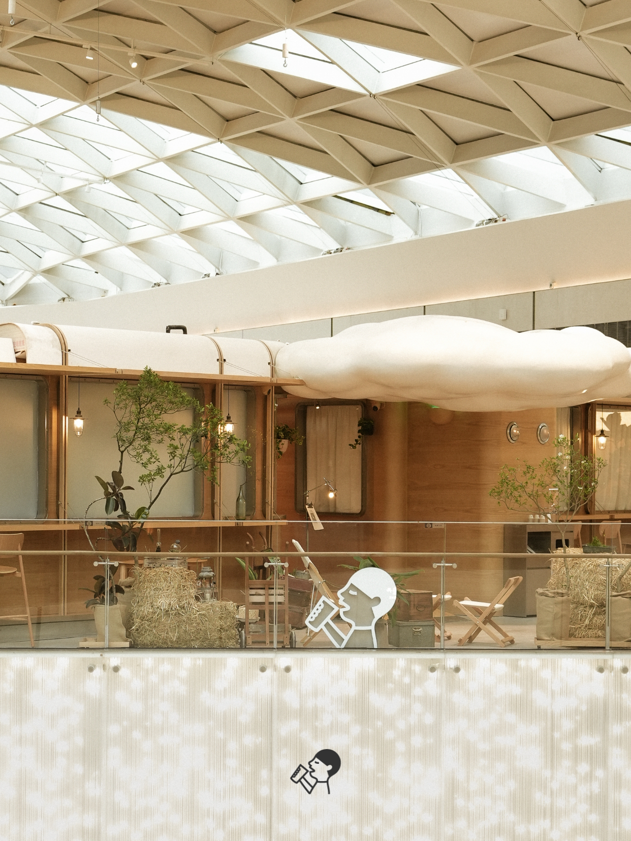 基于门店位处商业体中庭顶部的高空坐标,喜茶从经典产品元素“芝芝云顶”与cake lab的松软产品属性中提取造型灵感,在门店场景内融⼊云朵、餐车、茶箱和草垛等自然设计,将传统的制备区打造为一辆临时停靠的“云上列车”,外摆客座区的开放式设计模糊了门店与商场公共空间的边界,以轻盈、放松的场域氛围,为到访用户提供一个从快节奏的城市环境中短暂抽离的休闲空间节点。