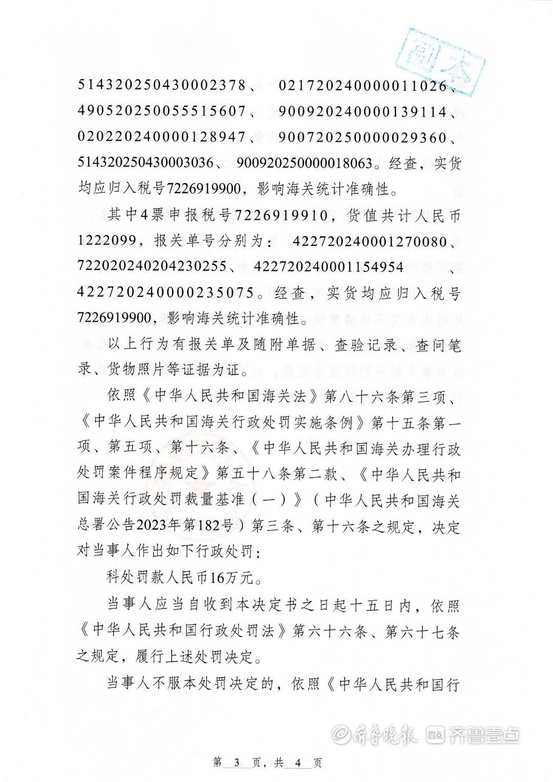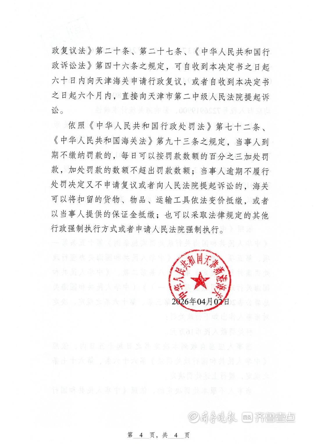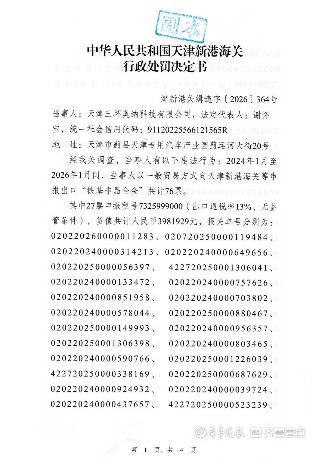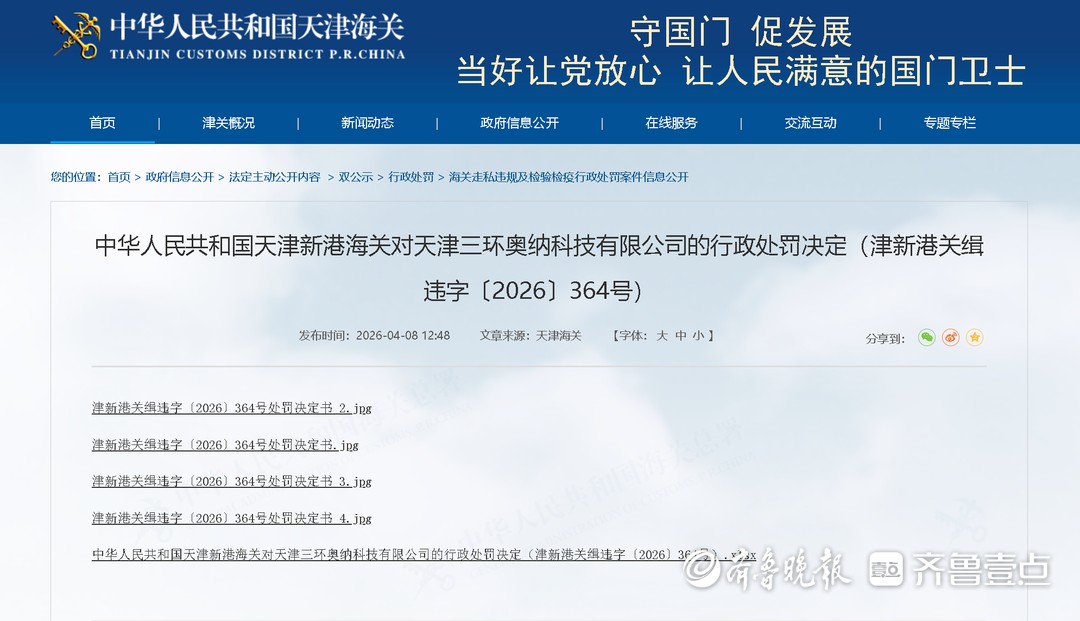 4月8日,中华人民共和国天津新港海关发布对天津三环奥纳科技有限公司的行政处罚决定(津新港关缉违字〔2026〕364号)。